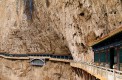 绵山天桥是绵山里一古遗四百余米,宽一米左右的云中栈道,上离山顶千尺,下距沟底万丈。 今天天气很好,走在天桥上并没有传说中云雾缭绕的感觉。 天桥靠近山墙的一边,有很多人文景观,如:诸葛亮和张良的修行洞等,桥上长洞内塑有老君历世应化身和古代四大发明家。